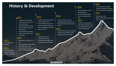 OUR INNOVATION SEEMILE firmly believes innovations drive an enterprise develop,and we do stand in the forefront of the development of laser display industry. In 2015,SEEMILE invented the world's first SLPL technology (Super Laser Phosphor Light) which is wildy used and iterated in our products to break the limit of projector Light Out (lumens) and rich image color. To date,SEEMILE has obtained more than 300 patents authorized, including more than 40 invention patents.
